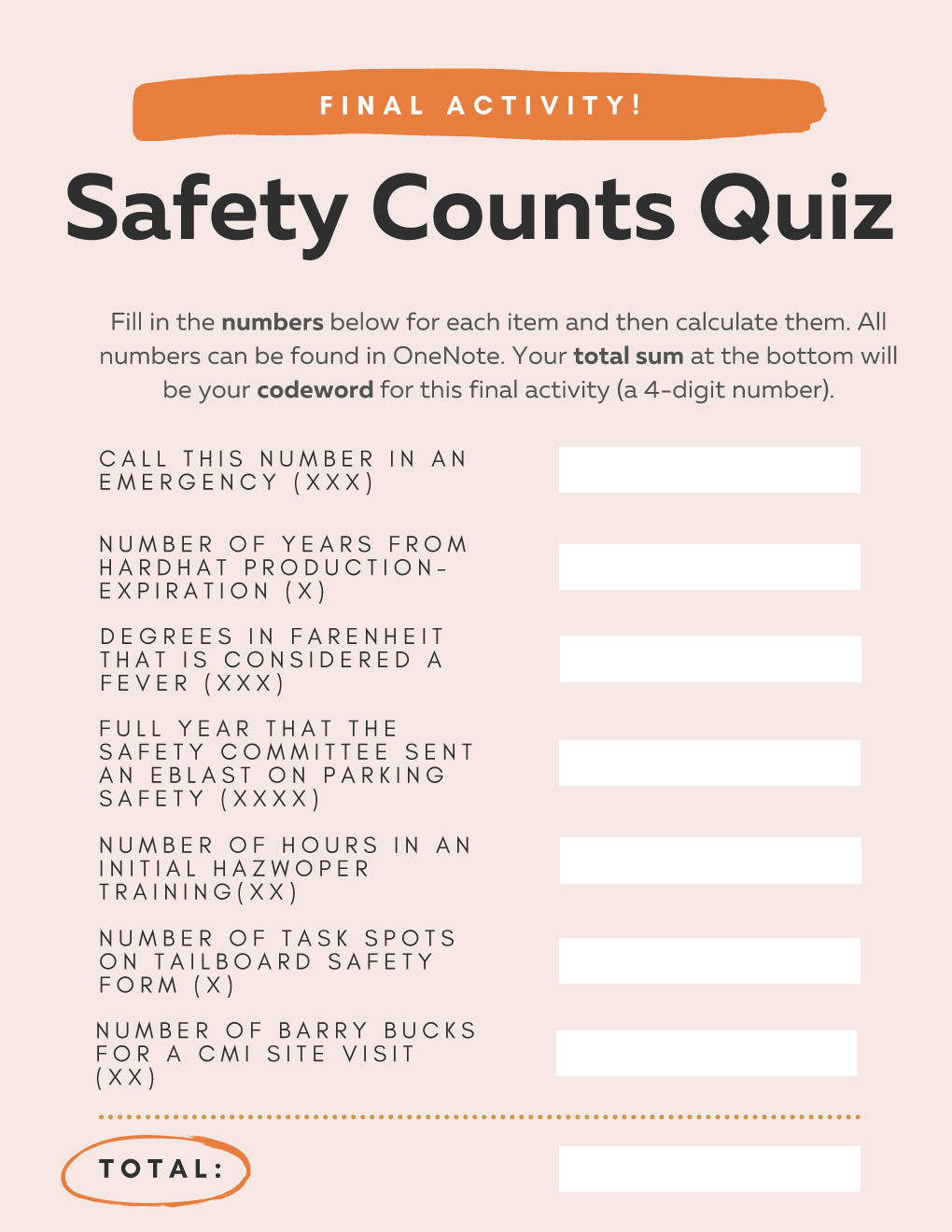 Your final puzzle is a focus on numbers. Grab your calculator – this is a tough one. Don’t give up, you can find the answers in previous safety blasts in OneNote.
